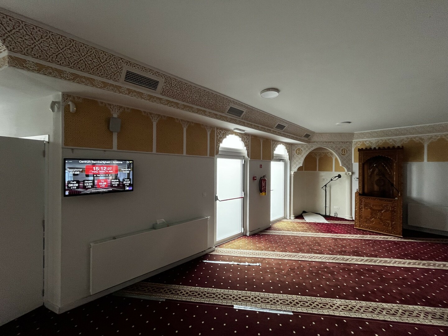 Between the athan and the iqama, and after each prayer, reminders and invocations are displayed. A Prophet's Hadith "May Allah's Prayer and Salvation Be to Him" is also displayed every 5 min